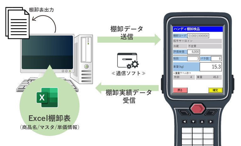 そこでPC側ソフトはExcelを採用し、Excel内で定貫区分や入数といった必要最低限のマスタ管理を行いつつ、マクロプログラムを組み込む形で簡易棚卸システムを構築。Excelソフトでありながらハンディ通信処理や在庫金額計算を行えるほか、棚卸表の印刷・保存は通常のExcel操作で行える仕様としました。これによりPC側ソフトの開発費用が大きく削減され、最小コストでの導入が実現されました。