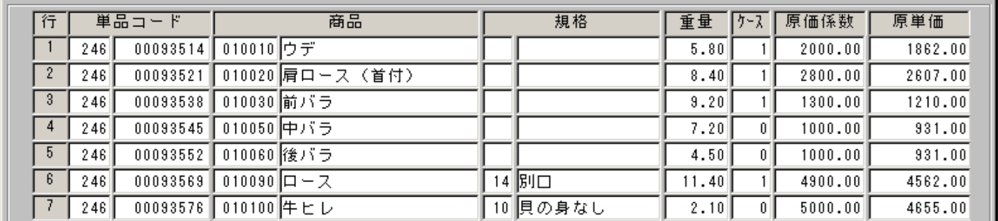牛枝肉は、市場で保管されている間に専門の格付員による品質評価が行われる。A5などの等級のほか、バラの厚みや脂肪交雑(BMS)などが記された格付明細書が発行され、購入側はこれを見て「この枝はこの納品先用に使おう」などと製造計画を立てたりする。上記の入荷入力では格付け評価の入力項目がないが、後述する製造指示時に格付明細書をもとに評価情報を入力して、商品ラベルに引き継ぐ流れとしている(※このへんのやり方は色々)。